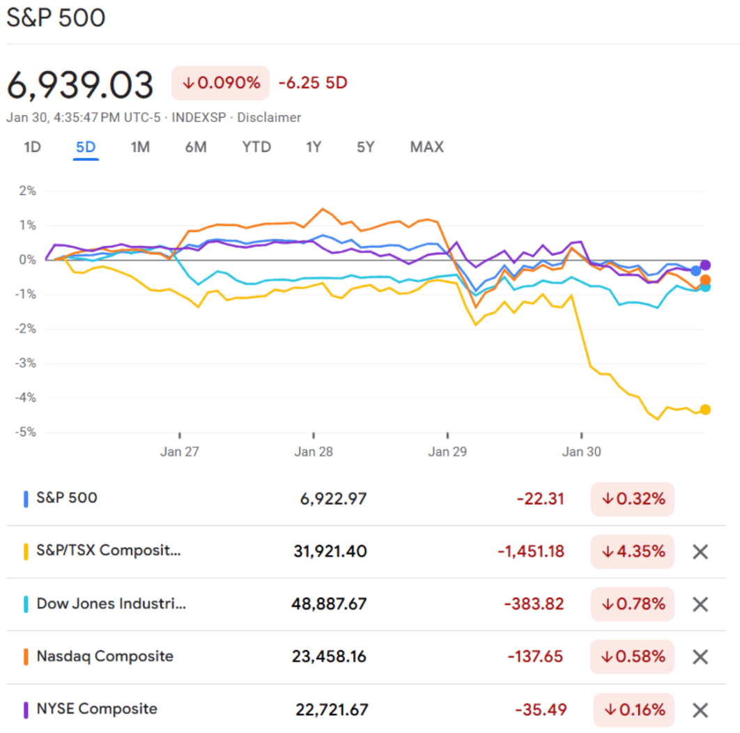 U.S. stock indexes moved in small, steady steps this past week, with the S&P 500, Dow, and Nasdaq hovering near record highs until a game-changing political wild card shifted sentiment.. Gains from Baker Hughes (BKR), Apple (AAPL), and Meta (META) helped offset drops from Microsoft (MSFT) and UnitedHealth (UNH), keeping markets mostly balanced earlier in the week while gold continued to make headlines, breaking past US $5,100 an ounce, while silver also surged. The U.S. dollar softened, Treasury yields held steady, and oil prices edged higher. Then, gold and silver experienced a sharp correction on January 30, 2026, with prices dipped. Gold fell below $5,000 per ounce, dropping 6–8%, while silver dropped by over 13% to around $100 per ounce.