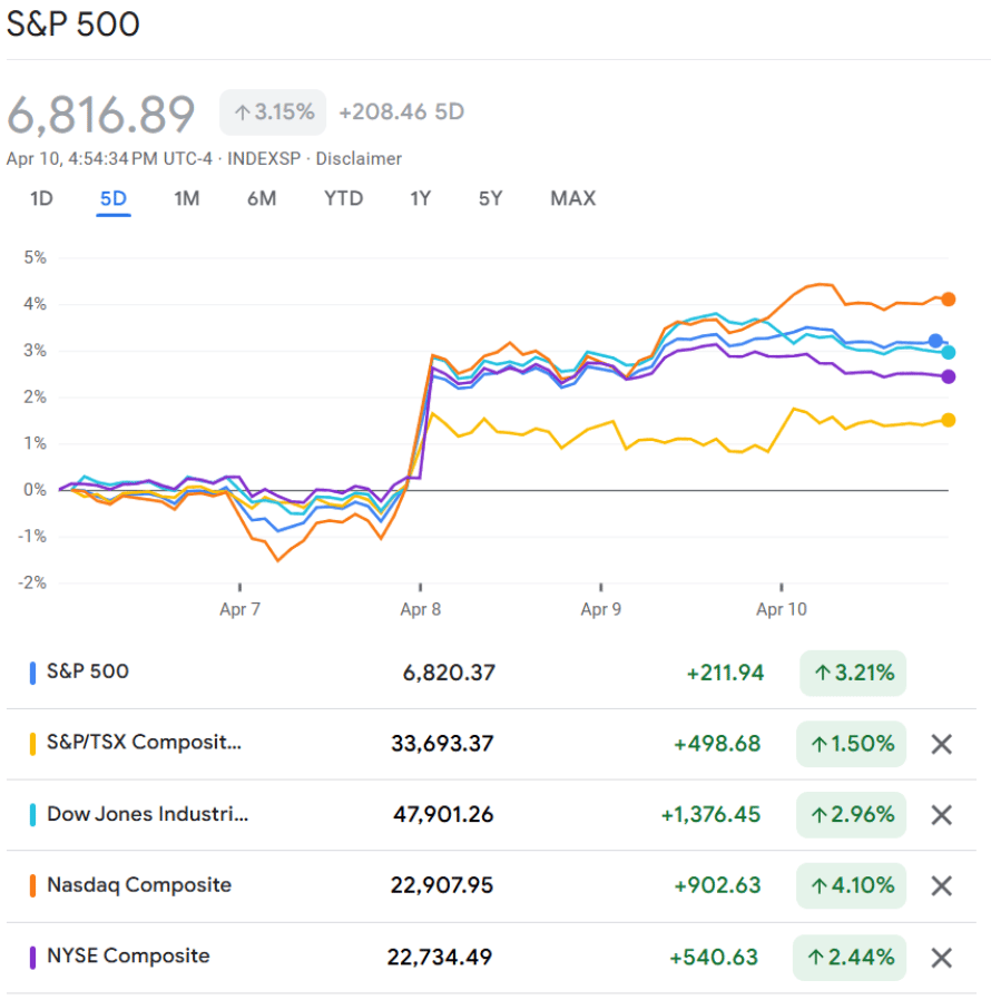 U.S. stocks moved through a volatile week, gradually trending higher but reacting sharply to shifting headlines and changing expectations for a ceasefire with Iran. Early gains were modest as uncertainty around potential military action weighed on sentiment, while oil prices fluctuated on concerns about global supply routes. Midweek, markets fell ahead of a key deadline before quickly reversing as diplomatic developments and a temporary ceasefire eased pressure. A strong rally followed across major indexes, including the S&P 500, Dow, and Nasdaq, before trading stabilized with smaller moves as investors balanced improving sentiment against ongoing geopolitical risks.