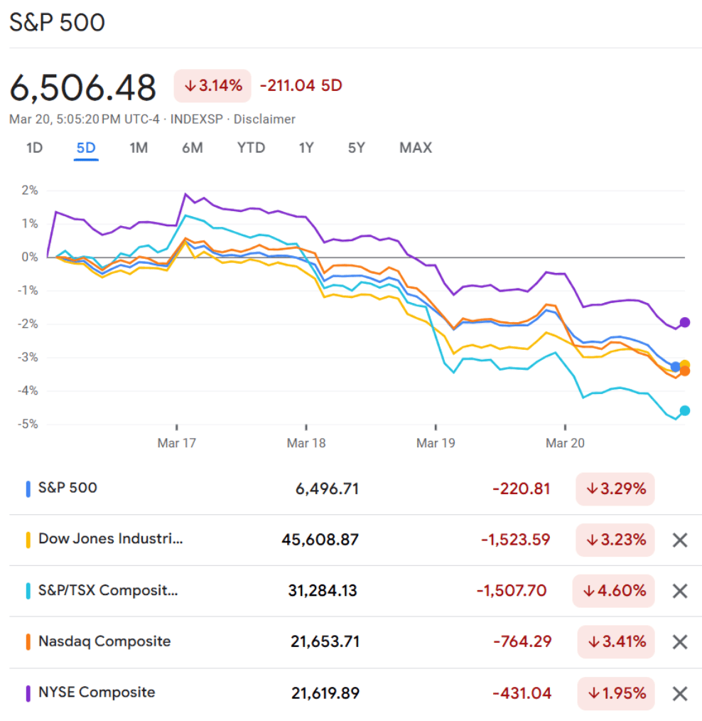 Canadian stocks bounced around last week as oil prices and U.S.-Iran headlines set the tone. The S&P/TSX climbed on Monday and Tuesday, lifted by energy gains, dipped on Wednesday as oil surged, and fell again on Thursday with ongoing geopolitical uncertainty. Despite the swings, big players in the energy sector like Canadian Natural Resources (CNQ) and Suncor (SU) helped the TSX outperform some global peers. Although the TSX had a rocky week, the micro landscape looked bleak, with Canada’s economy unexpectedly shedding 84,000 jobs, driving up the unemployment rate to 6.7%. The effects could have a further detrimental effect on real estate.