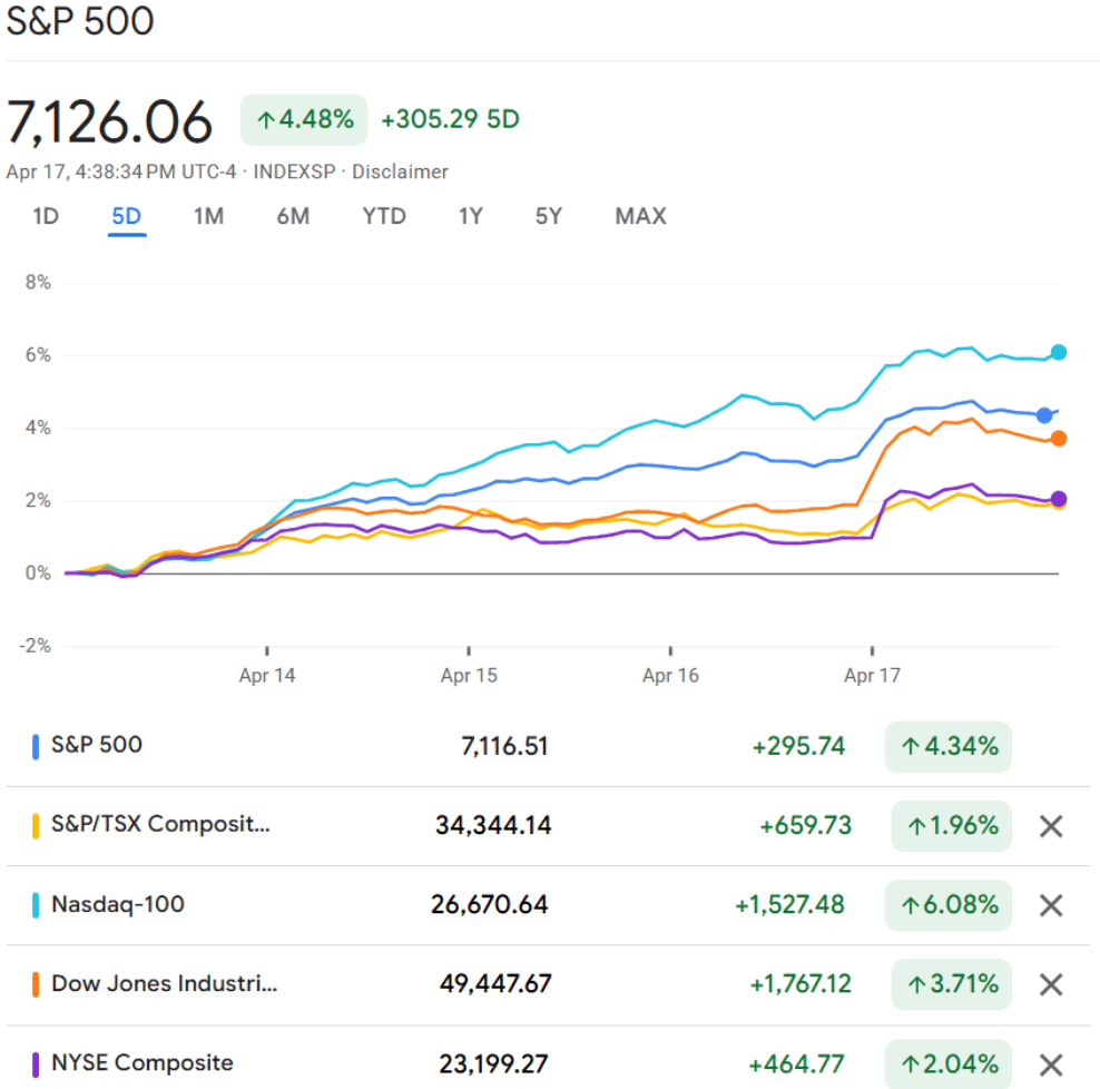 Canada’s stock market had a choppy but ultimately upbeat week as the S&P/TSX moved higher alongside U.S. equities, with oil easing back from earlier spikes to just under US $100 per barrel. Investors leaned into a “relief rally” as hopes for a fragile Middle East ceasefire helped calm energy fears. Technology was the standout driver, with money rotating back into growth stocks after a rough stretch, while defensive sectors like utilities and consumer staples lagged. Midweek pullbacks reflected a brief pause after a sharp run-up, but overall sentiment stayed resilient, with markets favoring risk-on trades over caution.