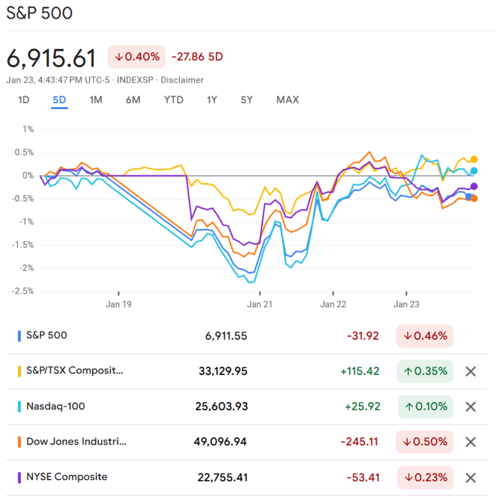 Wall Street had a classic mood-swing week. Markets tumbled early after President Trump floated new tariffs on several European countries, sending stocks sharply lower and rattling investors. Midweek, the tone flipped when those tariff threats were walked back following talk of a Greenland deal, sparking a relief rally that clawed back some losses. By Thursday, stocks kept inching higher, though nerves were still visible beneath the surface. The week ended quietly, with markets treading water as mixed earnings, a weaker dollar, and record-high gold prices hinted that caution hasn’t gone anywhere.